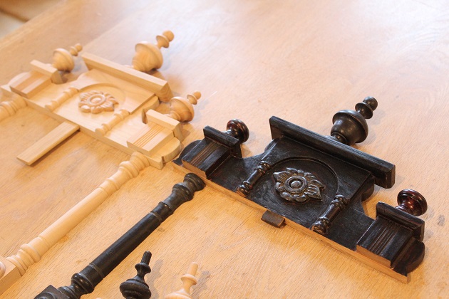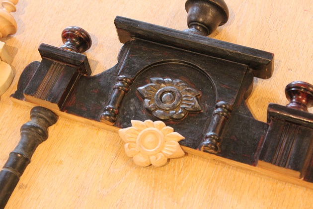 「前にやってもらったから、またやって」と急に頼まれることがある仕事。リペア、修繕、お直し系です。去年は神社の懸魚でしたが今年は柱時計の飾りの部分でした。この手の注文はほぼ挽物では無い事が多く(笑)印象的なデザインに挽物が使われている、といった感じでしょうか。それでも頼ってくださればやるほか無いのが職人の性。