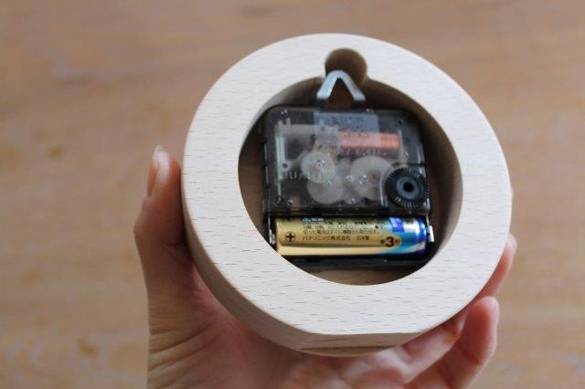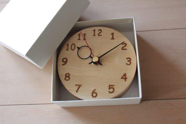 手のひらサイズのかわいらしい木の時計が出来上がりました。文字盤はレーザー加工でお入れしてあります。壁にも掛けられますし、デスク前にもちょこっと置くことができます。お箱入りなのでこれからの時期、記念のお品や贈り物としても喜ばれると思いますよ。