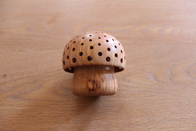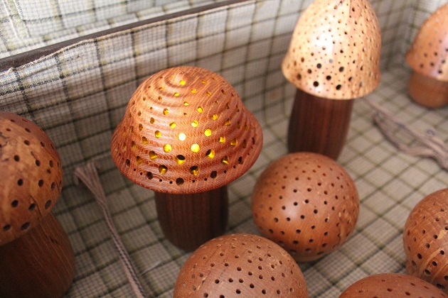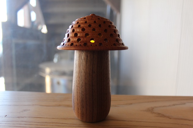 夜が長いこの時期、木の明かりはいかがでしょうか。ぽわっと照らすきのこは物語のワンシーンのようです。木の素材も色々使用しており、形も数種類。傘と柄は取り外せるので組み合わせが自由です。一番シンプルなものが定番で