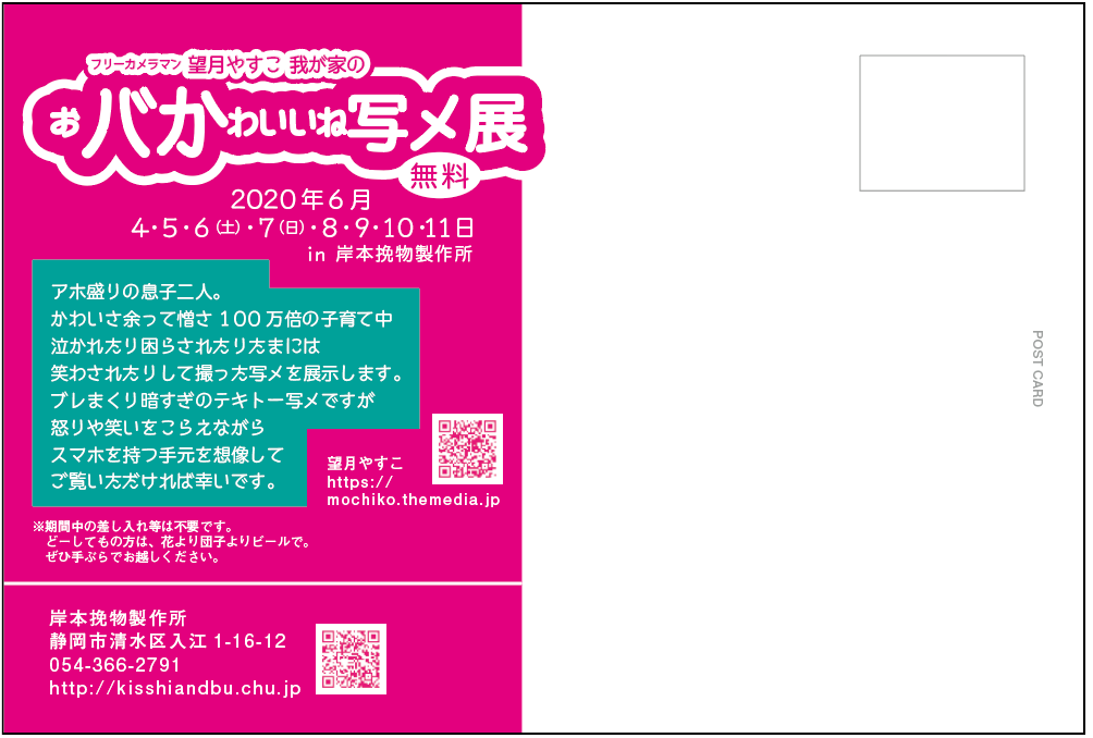 朝日新聞掲載中の「おバかわいいね写真館」で掲載された写真や子供達のクスッとしたしぐさなんかをかざろうという趣旨で、ともかくこの数日はやすこさんとげらげら笑ったり、大声出したり、子供達の悪口を言いながら愛おしんだり、旦那の愚痴を言いながら自己啓発したり、するつもりだったのです。ならばやっぱり世の中がすっきりした状態でなければいけない様な感じで、苦渋の判断でした。、、、は嘘で「まあやめておこう!」「そうだね!休校中のこどもがいて準備できないもんね!」って感じでした。
