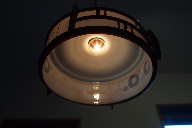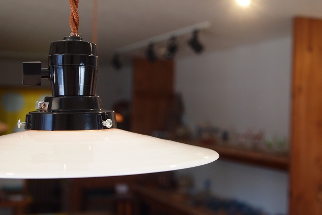 こちらの井形の部分は「エボナイト」製で、万年筆で使われる素材です。プラスチック樹脂とはちがって失透な光沢があります。少し傷があるためお求めやすいお値段にしました。ねじりコード付きソケットとセットですので、そのままお部屋に設置頂けます。アンティークについてのご質問等、分かる範囲でお話しますのでぜひ見に来てくださいね。