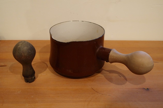 そういえば、ちょっと変わったお仕事がありました。お鍋の持ち手のお直しです。メールでお問い合わせを頂いてその後ショップへご来店。これはなかなか味のあるミルクパンだ、と思ったらやっぱりDANSKの古いものでした。今のタイプと握りが違ってとても持ちやすく出来ていました。「テープ貼ったりして何度も直したんですけどね」と仰っていて相当気に入ってらしたんでしょう。いくつか試作してなかなかしっくりくるには難航しましたが、これかな??という物が出来ました。「これでまた長く使えます。」と嬉しい感想を頂きました。良かったです。