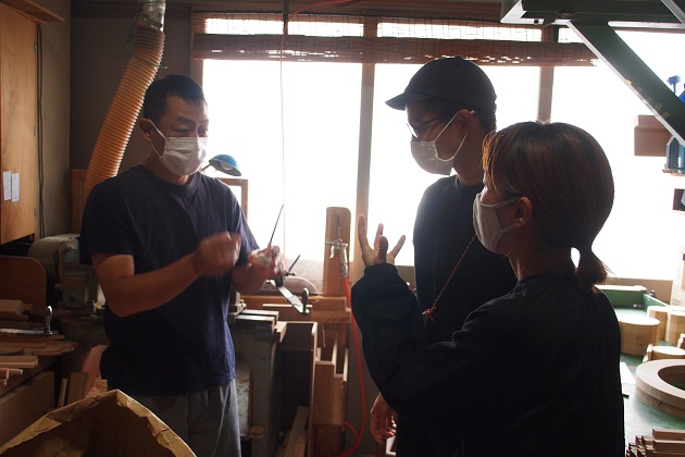 岸本挽物の工場も熱心に見学のナカリ夫妻。