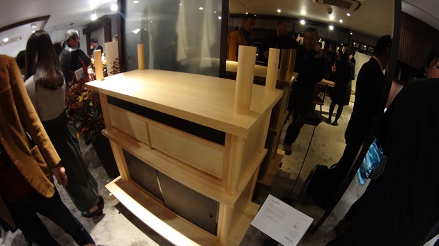実際にお披露目もされていました。。ぱっと見たらわかりずらいですが、本当に絶妙なプロダクトで見えない所にこだわっていて釘は使わずに指物の技術と挽物の技術で作られています。図面を見たとき二人は頭を抱えていましたがでもやってやるぜ、みたいな闘志が燃えていたのも確かです。通し木目で作られた丸棒なので失敗は絶対に許されないシビアな仕事です。指物の組み方もすごく複雑で更に和紙がふすまの様にはられています。その図面をさらっと渡してきた方がこちら。