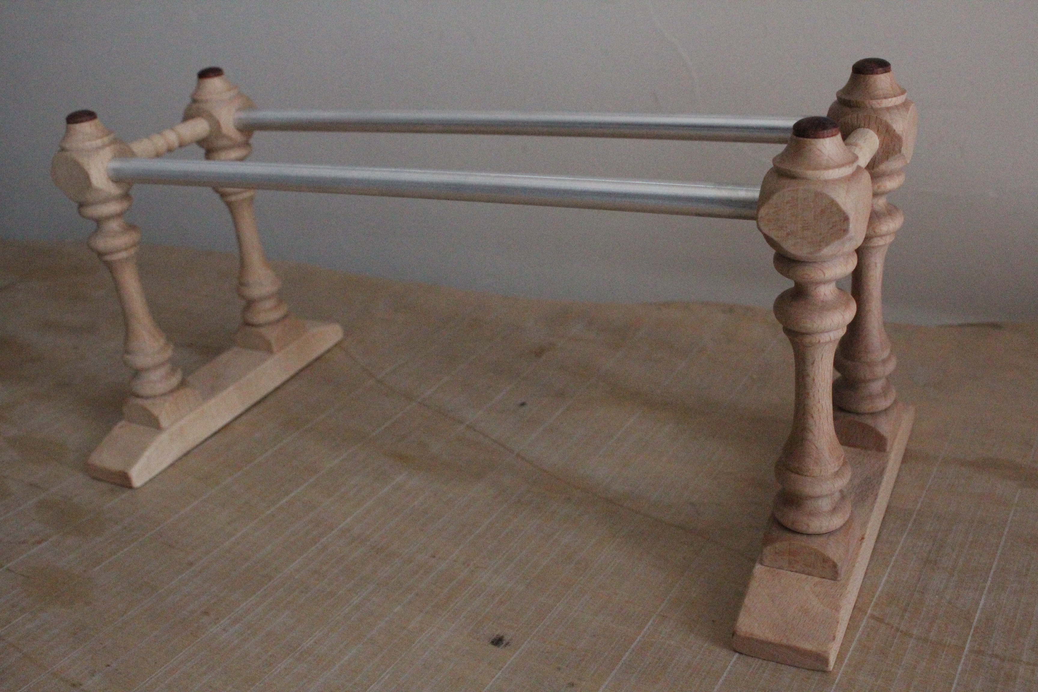 業務用のスタンドはステンレス製が多いのですが、レトロな喫茶店に合うようにデザインしました。素材は茶色がウォールナット材、白っぽいものがホワイトアッシュ材です。ウレタン塗装してありますで、汚れにくく、ロトを乗せるステンレスバーも10㎜ありますので、安定します。