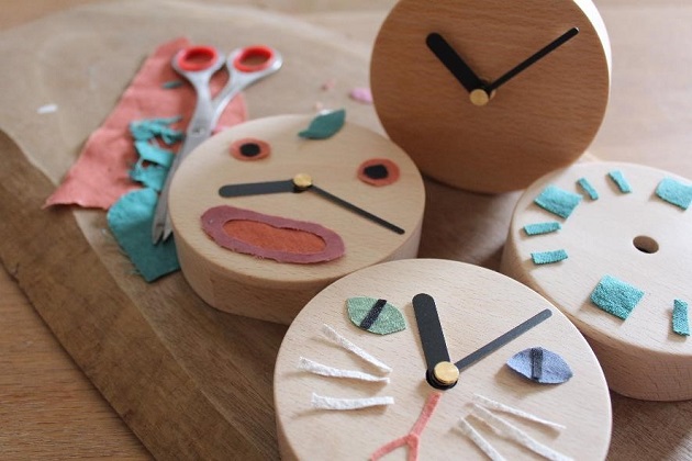 布を切り取って貼ったり、アクリル絵の具でイラストを施したりして世界にひとつのオリジナルの時計を作ります。作業工程上の規格で外れた材ですが目立った傷などはないので大変にお得なワークショップです。