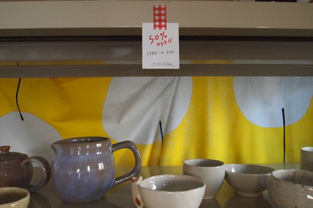 ショップでひと棚分のお買い得市をします。やきもの多めです。